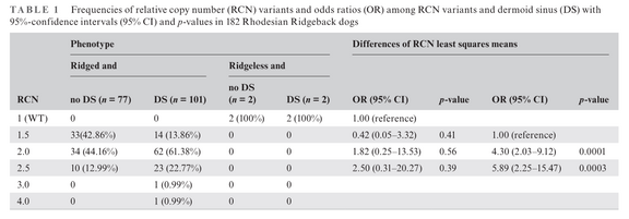 In der Publikation von Zhang und Distl (2022) wird eindeutig nachgewiesen, dass das Risiko einen DS zu entwickeln mit der Kopienzahl duplizierter Gene an diesem Ort korreliert. Hunde mit 2 Kopien (2.0 RCN, Genotyp R/R) haben ein 4,3-fach höheres Risiko zu erkranken als Hunde mit 1,5 Kopien (Genotyp R/r). Es gibt offenbar Hunde mit mehr als 2 Kopien. RCN 4 bedeutet, dass die Hunde 8 Kopien besitzen. Man sieht auch, dass das DS Risiko bei Hunden mit 2,5 Kopien im Vergleich mit Hunden mit 1,5 Kopien auf das 5,89-fache, also nochmals ansteigt (vorletzte Spalte in der Tabelle).